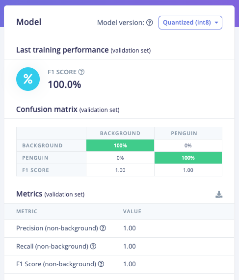 On the right, you will get a confusion matrix: this table gives a quick overview of how well (or bad) the model performs on your data. Of course you aim for a 100% score, but that's not always the case. As a first try, anything above 90% should be a good starting point.